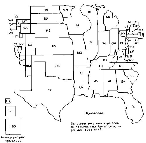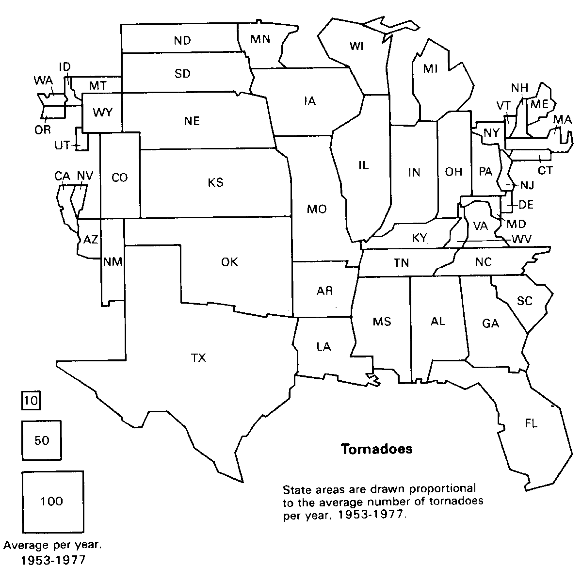 Joonis 22 Pindalakaardil on näidatud tornaadode esinemissagedus USAs (Dent, 1990). Iga osariigi pindala on muudetud nii, et see oleks proportsionaalne tornaadode arvuga aastas. Samas on püütud säilitada osariigi kuju ja asetust teiste suhtes.