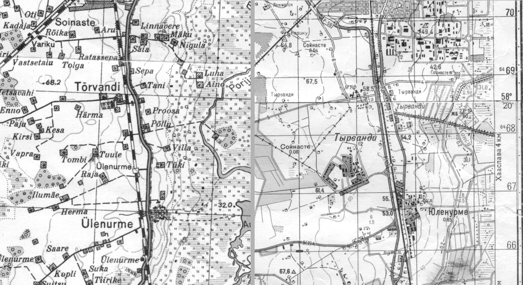 Joonis 24. Vasakpoolsel kaardil (1:50 000 topograafiline kaart aastast 1937) asub Tõrvandi praeguse raudteeülesõidu kohal. Parempoolsel kaardil (1:50 000 topokaart aastast 1989, vastab asulanimede osas ka 1996 aasta seisule) on Tõrvandi alevik endiste Tombi, Tuule ja Raja talude maadel. Kas 50 aasta jooksul on 1.5 kilomeetrit lõuna poole liikunud asula või ainult tema nimi?