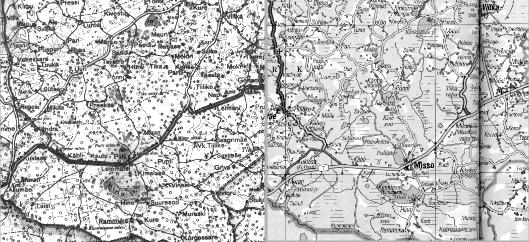 Joonis 25. Vasakpoolsel kaardil (1:200 000 topograafiline kaart aastast 1939) loeti Missoks mõisa asukohta. Parempoolsel kaardil (1:200 000 REGIO Teede Atlas 97) on Misso alevik endiste Pulli ja Lemmatsi külade asemel. Endiseid külanimesid mäletavad ainult kohalikud elanikud.