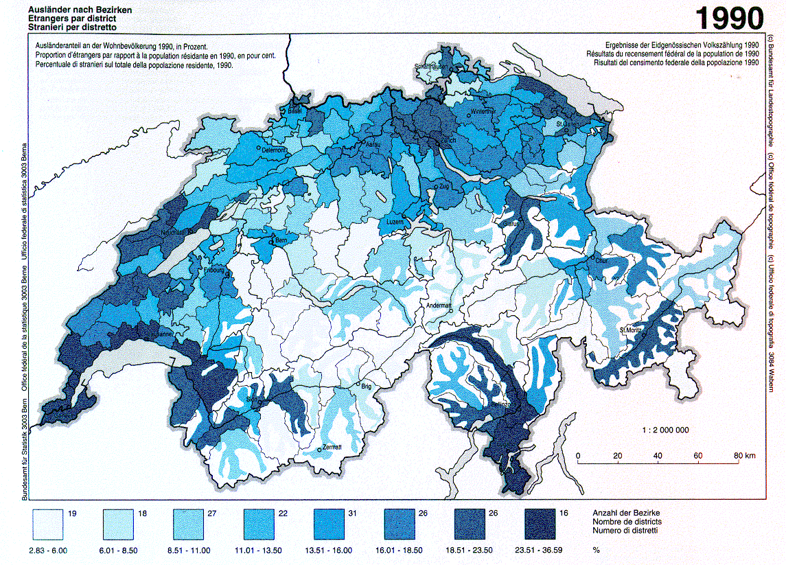 Joonis 27 Kvaliteetse teemakaardi näide (Steffen&Haug 1995). Ülemine teemakaart (välismaalaste osakaal) on tehtud kiirustades ning väikese eelarvega. Kasutada oli ainult kaks trükivärvi. Alumine teemakaart on valmistatud digitaalselt, kaasaarvatud reljeefivarjutus. Näha on, kui oluline on Šveitsi puhul reljeefivarjutuse kasutamine, sest lõuna pool on haralise kujuga alad põhjustatud mäeahelikest. Reproduktsioon ei anna adekvaatselt edasi kaartide tegelikku kvaliteeti.