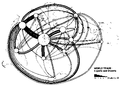 Joonis 23 Vookaardi näide (Dent, 1990). Kaardil on näidatud maailma suuremate majanduskeskuste omavaheliste import-eksporttehingute maht noolte abil. Noole jämedus väljendab tehingute mahtu.