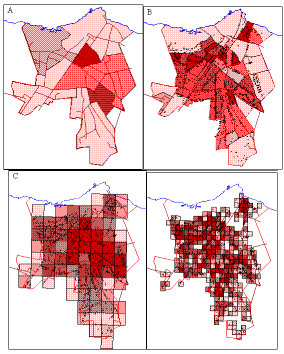 Kvartalid ei pruugi samuti kõige otstarbekamad esituspinnad olla. Kvartalid on üldjuhul väga erineva suurusega, eriti linna servades sisaldavad nad palju tühermaad. Kaardil B on linna idaservas näha tihedalt paigutatud majade kogum, kuid vastava kvartali keskmine elanike tihedus on suhteliselt väike. Juhul, kui kasutada korrapärast võrgustikku, mille silmade suurus on sobivalt valitud, siis kirjeldatakse korrektselt väiksemad tihedalt asustatud alad. Võrgu silmade vähendamine ei pruugi esituse täpsust tõsta - liiga tiheda võrgustikuga kaart D ei annagi ülevaatlikku pilti. Eesti linnade puhul võiks kasutada 250 meetrilist võrku, maapiirkondades ehk 500 meetri võrku.