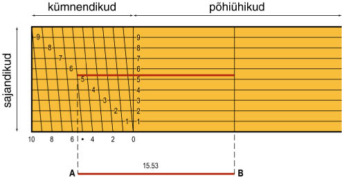 | kaart on mõõtkavaline maapinna tasapinnaline kujutis. See tähendab, et kaardil mõõdetud joonepikkusi võib usaldada. Kaardi mõõtkava täpsuseks loetakse kaardil 0.1-0.2 millimeetrile vastavat joonlõiku looduses, Eesti põhikaardil puhul tähendab see seda, et mõõtmistulemused on kaardil sooritatavad täpsusega, mis looduses vastab vähemalt 5 meetrile. Täpsuse saavutamiseks kasutame põikmõõtkava. Joonisel on toodud näide joone AB pikkuse määramisest põikmõõtkava abil, mis tulemuseks on andnud 1553 m. Komakohad arvestatakse vastavalt kaardi mõõtkavale. |