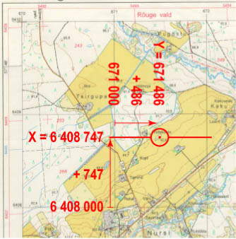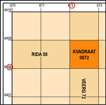 Viitamine asukohale kaardil Ülesandes on antud kahe punkti asukoht kaardil nn kiirkoordinaatides. Kiirkoordinaadid osutavad ristkoordinaatvõrgu ühele ruudule (kvadraadile), täpsemalt küll selle ruudu lõuna- ja läänepoolsele võrgujoonele. Kiirkoordinaadid kujutavad endast neljakohalist arvu, millest kaks esimest märgivad sajalisi kilomeetrivõrgu X-koordinaadist ja kaks tagumist Y-koordinaadist (vt kõrvalolevat joonist). NB! võrreldes matemaatilise tähistusega on geodeesias teljed pööratud: X-telg on suunatud geodeesias tähtsaima lähtesuuna – põhjasuuna – sihis, Y-telg on suunatud itta. Joonobjektide puhul, mis ühte kilomeetrivõrgu ruutu ei mahu, viidatakse kahele ruudule – ühele, kus joon algab ning teisele, kus lõpeb. |