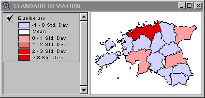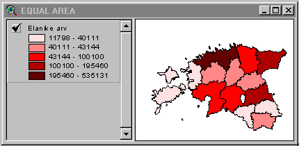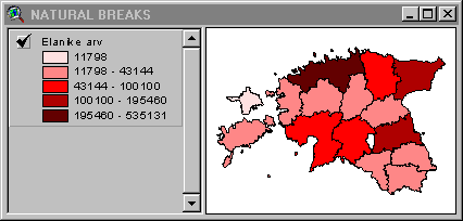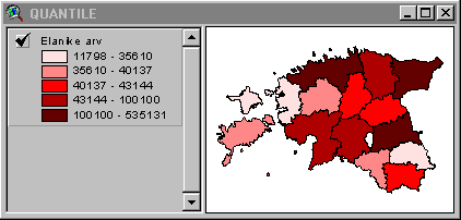 Nagu näha, pole jaotus ühtlane: Harjumaal on rahvast tunduvalt rohkem, ligemale pooled maakondadest on aga üsna ühesuguse rahvaarvuga. Koostame nende andmete alusel temaatilise kaardi, rühmitades andmed nn. kvantiilide meetodil, mis tagab, et igasse rühma satub võrdne arv objekte. Seda meetodit kasutavad nii ArcExplorer (ainus võimalus) kui ka Microsoft Map (vaikimisi võimalus).
