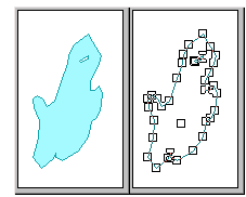 Aktiviseerides järvede kihi ja otsides omaduste tabelist nime "Pühajärv", saame leida vastava tabeli rea ning sellele vastava pindobjekti. Vasakul olevail illustratsioonidel on teised kaardikihid "välja lülitatud" ning Pühajärv suumitud (suurendatud) sedavõrd, et tema kaldajoone moodustumine punktidest ja sirglõikudest oleks selgesti näha. Tasub tähele panna, et järv (pindobjekt) võib sisaldada endas saari (teisi pindobjekte).