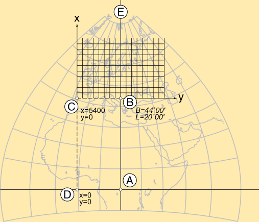 Projektsioonil valitakse tavaliselt teatud geograafiline punkt B, millest lähtuvalt määratakse tasapinnaliste ristkoordinaatide süsteem xy. Seda punkti nimetatakse lähtepunktiks ja reeglina valitakse see projektsiooni olulistel telgedel – nt ekvaatoril või telgmeridiaanil E. Nimetatud telgede järgi on ristkoordinaatsüsteemi kõige lihtsam orienteerida. Niisiis telgmeridiaan määrab ära x-telje suuna ja tavaliselt ekvaator y-telje oma.