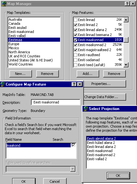 Avanevas dialoogikastis (Configure Map Feature) tuleb paika panna, milliste MapInfo omaduste tabeli välja(de) ja Exceli tabeli veegude vahel peab olema 1:1 seos, et kaarti andmetega seostada. Lõpuks tuleb määrata kaardikiht, mis defineerib kaardi projektsiooni. Kõik need andmed peavad häälestajal juba teada olema. |