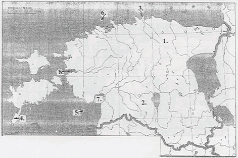 15. Märgi Eesti kontuurkaardil numbritega 1-8 tähistatud kohanimed punktiirile. (4 punkti)