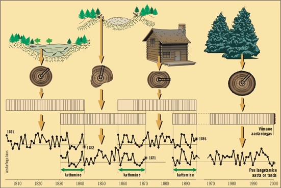 Samamoodi saab leida näiteks liustikumoreeni mattunud puude hukkumisaastad (joonisel ülal) või sooturbas säilinud mändide eluaastad (joonisel vasemal).