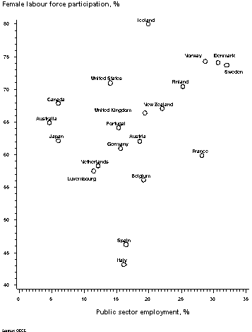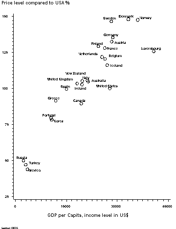space. ![]() Figure 2. Public sector employment and female labour force participation, OECD countries. In general »identity« is difficult to quantify and thus to compare both between states and between regions. However figure 1 to 5 are attempts to plot indicators for some economic and social differences between the Nordic countries and other countries, mainly covering the points 9-12 on the Nordic Council's list of features above. Figure 1 plots income level and price level in the OECD countries and Russia, according to recent international statistics. The Nordic countries are rich and have been so for decades. In 1995 GDP at current exchange rates amounted to 25.800 US$ per capita in the four non Atlantic/Arctic Nordic counties. This was well about the European Union average, but slightly below USA. Moreover the price level is high especially in Sweden, Denmark and Norway. But all Nordic countries are found in the top of figure 1 slightly above central Europe countries like Germany, France, Benelux and Austria. Russia is in the opposite corner with low income and low prices as in the poorest OECD countries: Turkey and Mexico. Differences on the horizontal axis of figure 1 show differences