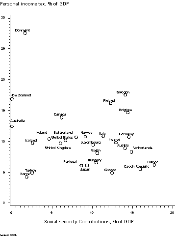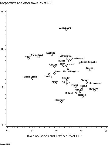 ![]() Figure 4.Labour taxes in OECD. However taxes are considerably higher in Denmark. Unfortunately there are no figures for Russia, but it is likely to assume that both taxes and inequality are very different in the two parts of the Nordic external border region with Russia. Taxes can be assessed in different ways. Figure 4 shows plots of personal income tax against social-security contribution. Both are mainly related to the active population, and is to a large extent taxes on labour. But income tax is normally payed at the place of residence whereas the social-security contribution is payed by employees and employers at the place of work. Moreover tax generate collective rights for all inhabitants based on needs or objective measures like age and health, whereas social-security contribution generate individual rights based on previous payments. This may course problems in border regions where people can live in one country and work in another, and maybe move or change jobs over the border from time to time. For these issues there are large differences between Denmark and Germany and thus in this external border region. Figure 5 plots taxes on goods and services against corporative and other taxes. The former are mainly taxes on consumption whereas the latter include taxes on capital and property. Taxes on goods and services are much higher in Denmark than in Germany, which can cause problems in the border region. The Nordic identity leads to Nordic cooperation. Both passport-union