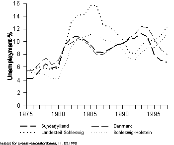 and a free EEC labour market since 1973. ![]() Figure 6. Unemployment in the two parts of the border region compared to Denmark and Schleswig-Holstein. But, both migration and border commuting remained at a very low level (Pedersen 1996, Hansen 1994). In 1995 only 1.300 people commuted from the northern to the southern part of the border region and only 1.000 people commuted in the opposite direction. This is only one tenth of what one could expect if there were no border barriers and if incentives were given by urban structure (Hansen and Schack 1997). The barriers mainly concern culture and language and to some extend tax and social security legislation, whereas work and stay permits, border control formalities and infrastructure cause few problems. Incentives to commute may be found in wage differences, differences in employment opportunities, housing prices and access to amenities and - due to the border - tax arbitrage and speculation. Barriers seems larger than incentives. This could be interpreted both positively and negatively. Small incentives mean that economic and other differences between the two parts of the border region are small and thus do not cause tensions between the populations. Integration, however, requires demolishing barriers. This is an independent EU objective and may lead to economic growth via better exploitation of economics of scale and scope in the border region. Small economic differences could be the results of the same level of backwardness in both parts of the border region. The two parts of the Danish-German border region has not developed