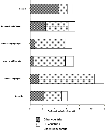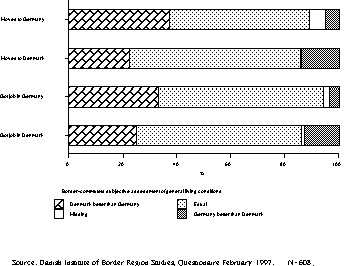 region. ![]() Figure 7. Foreigners in % of total population 1996 The opposite goes for the southern part of the border region: Unemployment follows the ups and downs in the Northern German State Schleswig Holstein, indicating that the dominant influence for the labour market comes from Kiel, Bonn and Frankfurt, and not from their near neighbour. Add to this that taxes and transfers like pensions are matters for the national states, and there is no doubt, that the welfare for most people in the border region is mainly influenced by national decisions and not by regional cross border cooperation. Migration and Living Conditions As mentioned the Danish-German border region was a functional region until 1920. Among other things the new border divided many families and friends. Contact, however, did not disappear and it is therefore to be expected that the border region contains a relative large foreign population. Minorities and their institutions pull in the same direction. Finally, living conditions could be different and people may move to the neighbour country to improve their standard of living. As mentioned there has been a free labour market since 1973, and since 1993 the housing marked has also been open to citizens from other EU-countries. The share of foreigners, however, is lower in Sønderjylland than in Denmark. This is shown in figure 7. Sønderjylland - the politically defined Danish part of the border region - has a much lower density of population from non EU countries but a higher share of people from EU countries, mainly Germany. The Germans in Sønderjylland are concentrated in the four border municipalities, especially Bov just north of the German town Flensburg with almost 100.000 inhabitant: After 1993 Germans purchased houses in Bov and took advantages of the lower prices in Denmark at that time. Today they are the largest group of border commuters. But for the regions as a whole the figures remain small. ![]() Figure 8. Border Commuters Subjective assessment of general living conditions. What figure 7 also shows is that the challenge from migration is not mainly a border region issue but a national one. Large cities - in the Danish case outside the border region - receive refugees and attract people from non EU-countries. Living conditions and incentives to cross the Danish-German border for work or to live in principle can be studied by looking at differences in wages, unemployment, housing prices and amenities as well as differences in availability of welfare and other services. Indeed the Institute of Border Regions Studies has done such investigations. Another way to put light to this important issue is to ask people who actually know both parts of the border region. That is what we did in a representative questionnaire to 608 border commuters. Their answers are found in figure 8. Most of them found living conditions equal. A relative large minority stated that life is better in the Danish part, and a somewhat smaller minority that the German part is better. The difference could be time dependent - when the questionnaire was made labour market conditions etc. were better in Denmark, but only five years earlier we had the opposite situation. Statistics for the border region population's behaviour as well